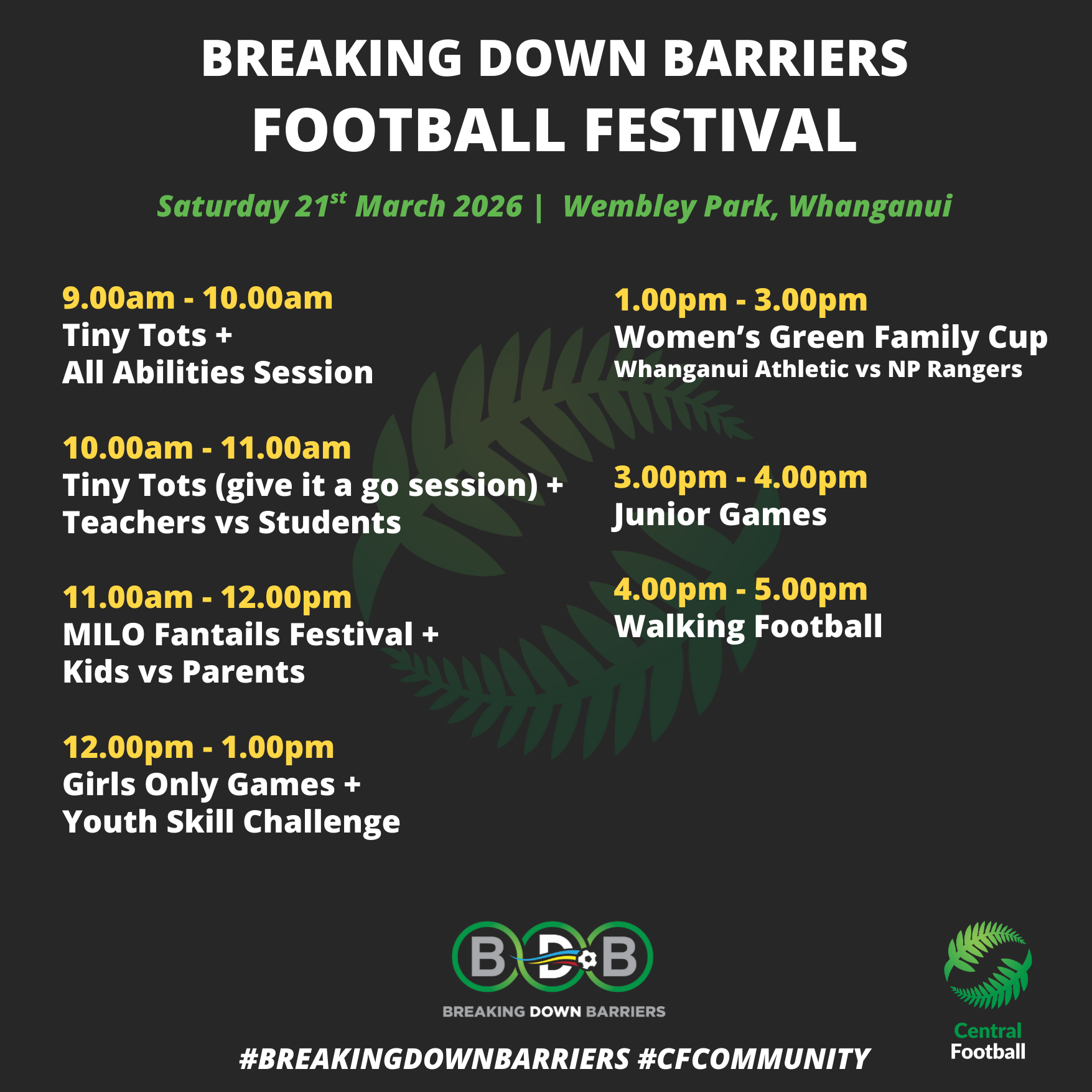 Central Football is thrilled to announce that they will be hosting the Breaking Down Barriers Festival on Saturday 21st March at Wembley Park, Whanganui. The inaugural event took place in Hawke's Bay in 2021, followed by Manawatu in 2024 and Taranaki in 2025, with the goal of raising funds and celebrating the sport we all love - football.